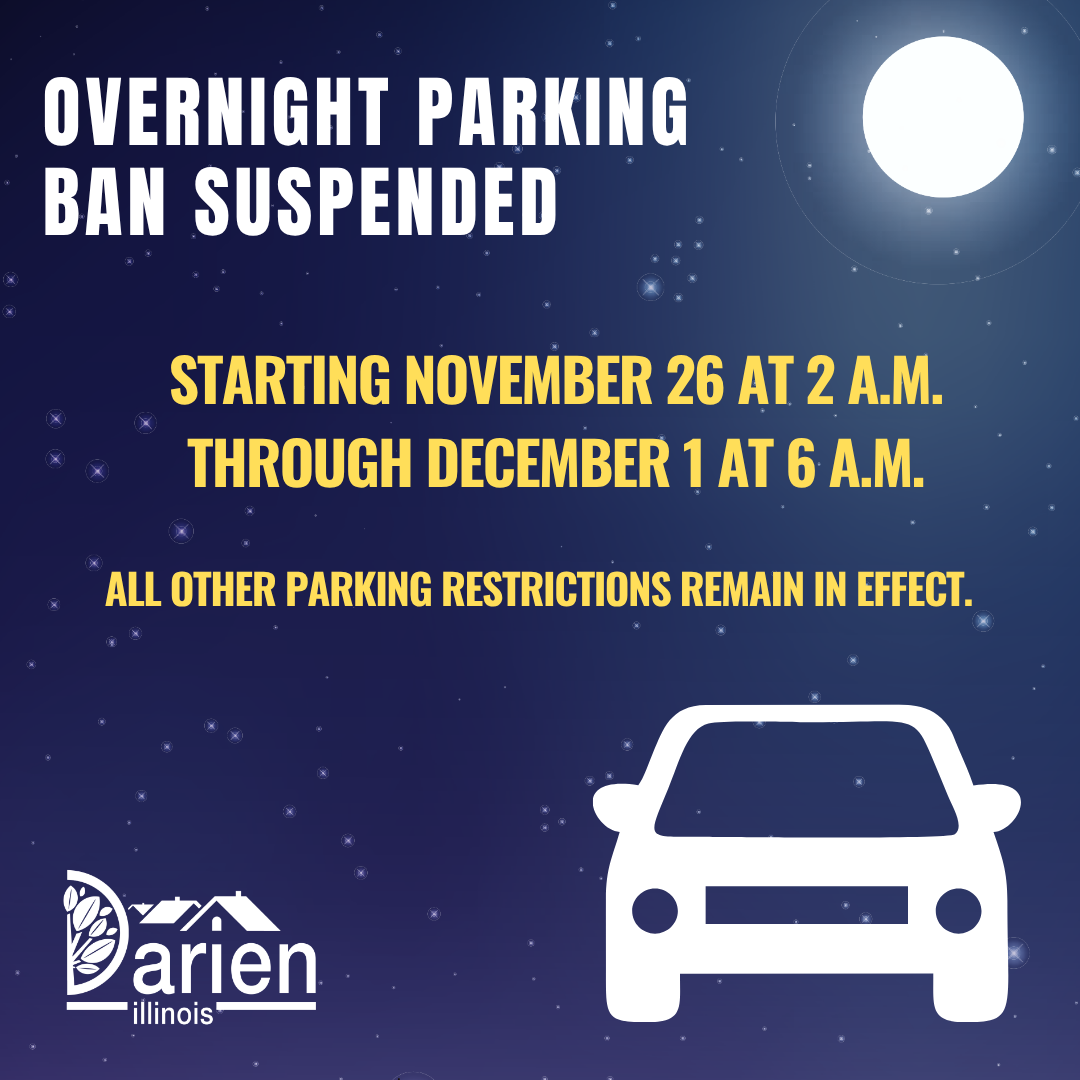 The City's overnight parking ban will be suspended from Wednesday, November 26 at 2:00 a.m. through Monday, December 1 at 6:00 a.m. All other parking restrictions will remain in effect.
